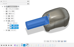 「結合」機能にて、ボディから「3」で作成した「2つの円柱」を切り取り、