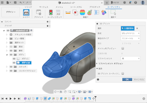 Fusion360→「ユーティリティ」→「メイク」→「3Dプリント」にて、それぞれのボディを選択し、STL形式で書き出しました。