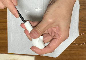 - 重りを首に入れ、首を胴体に糸で吊るす位置を決める。