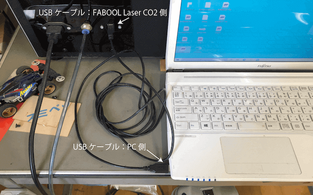 PCとFABOOL Laser CO2をUSBケーブルで接続する。