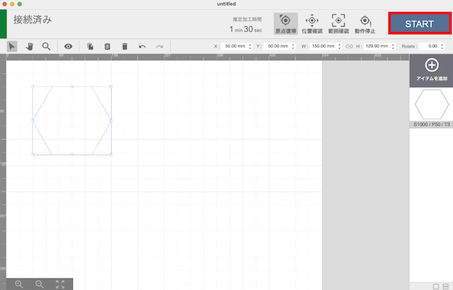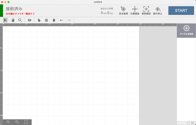 FABOOL Laser CO2のドアをしめ、画面右上の「START」をクリックします。注意内容を確認後、OKをクリックすると加工が開始されます。