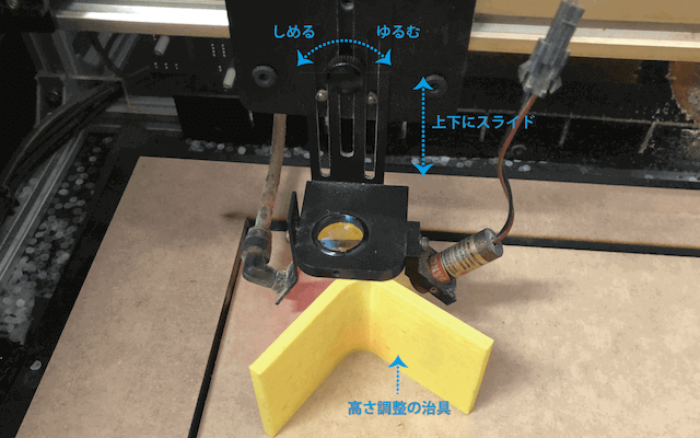 レーザーヘッドの高さ調整用の治具を、レーザーヘッドと材料の間に置き、レーザーヘッドのつまみネジを緩め、レーザーヘッドを上下にスライドさせて高さを調整します。