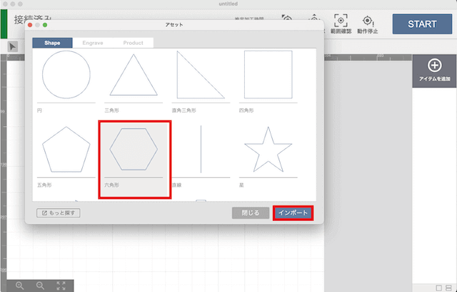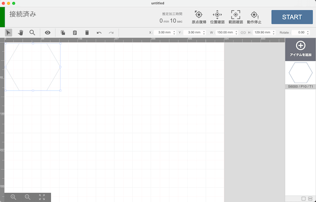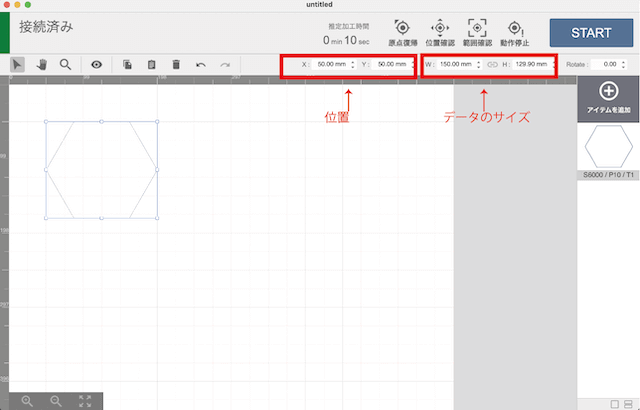 グラフィックエリアの「六角形」をクリックし、位置とデータサイズを入力します。(※任意)