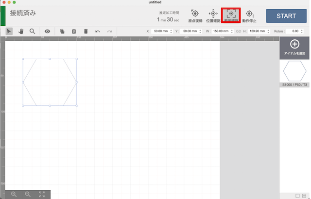 動作確認をクリックすると、データの外周をレーザーヘッドが移動します。この「動作確認」を繰り返し、データ・材料の位置を合わせます。