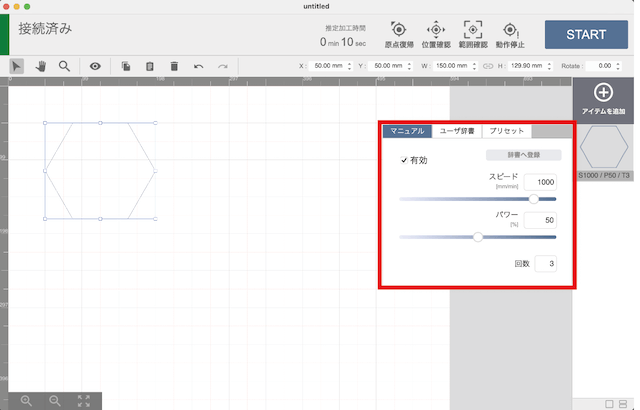 ソフトウェア画面右のアイテム(六角形)をクリックし、パラメータ設定ダイアログにて、パラメータの設定をします。今回は、プリセットタブにある「ベニア」→「ベニア3mm切断」を適用します。