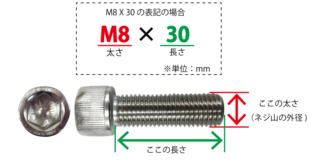 - M6×20mm = ネジの外径が約6mm、長さ20mm