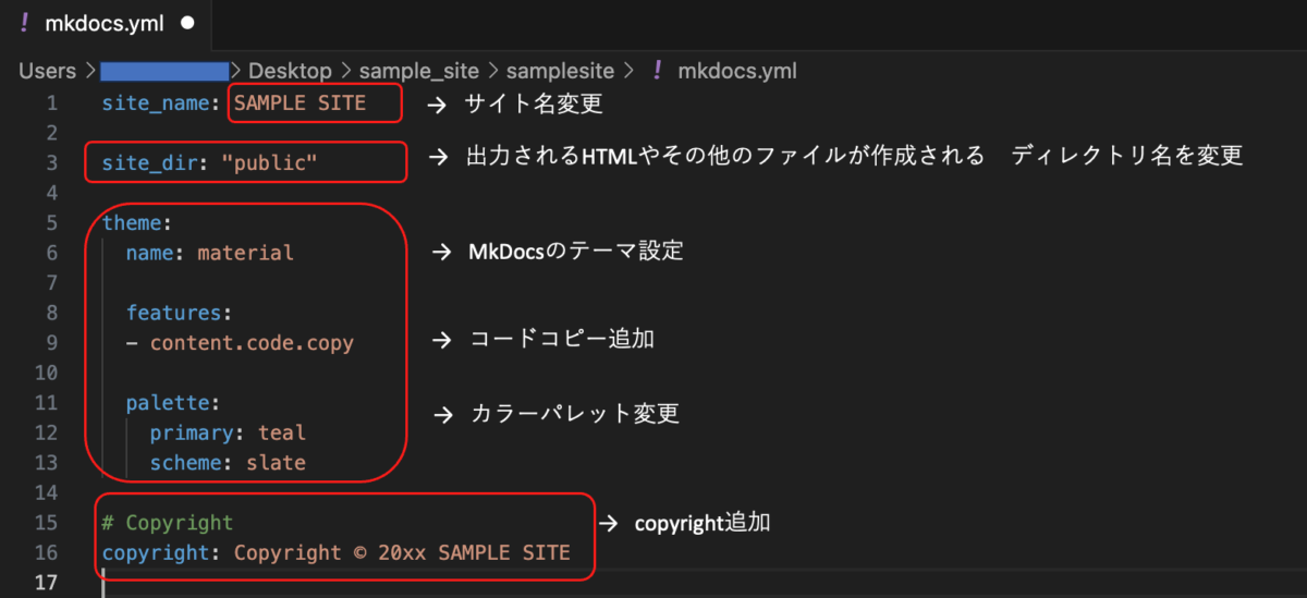 私の場合、mkdocs.ymlのファイルを下記通りに変更しました。