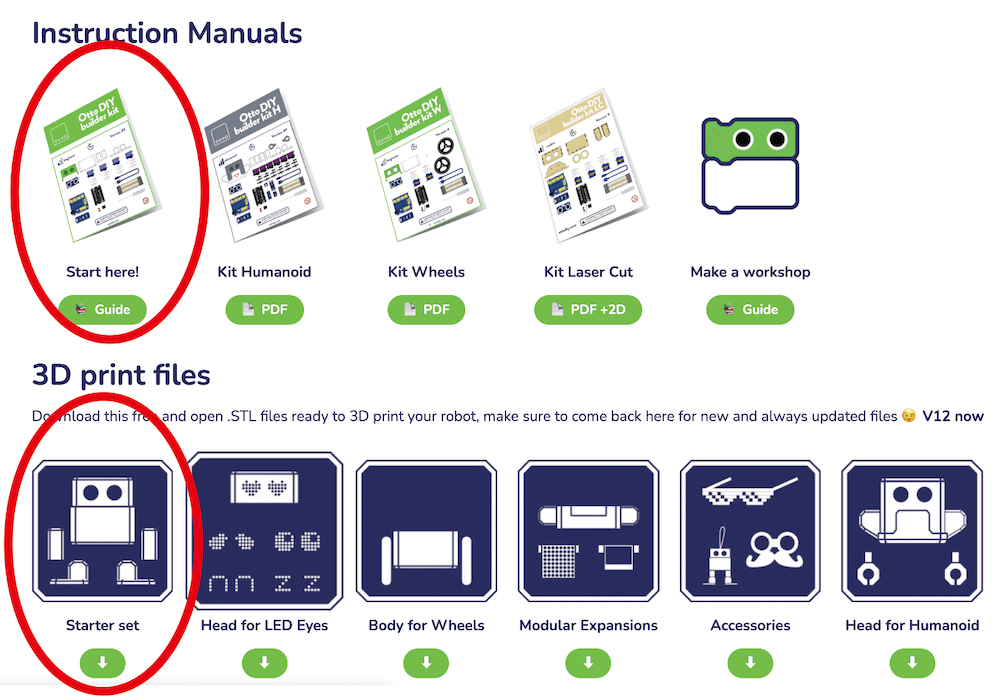 一番シンプルなマニュアル『Start here!』とボディの3Dプリントファイル『Starter set.V9』を入手しました(※丸印)