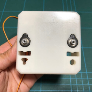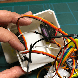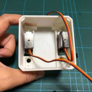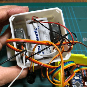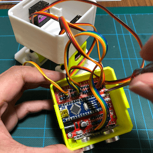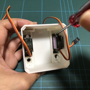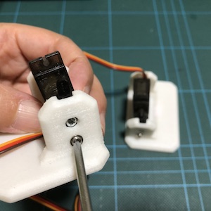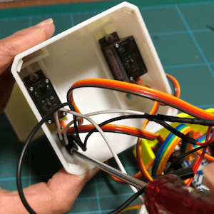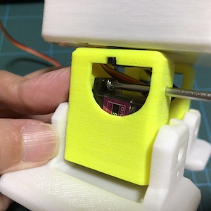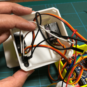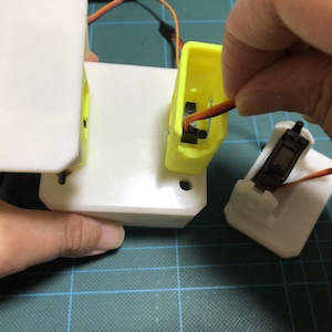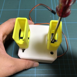 この作業はかなり困難でした。ドライバーが動かしづらい上、サーボの配線を避けつつの作業で、ネジが何度も転がってしまいました。大人でも困難な作業なので、子供は更に苦労しそうです。