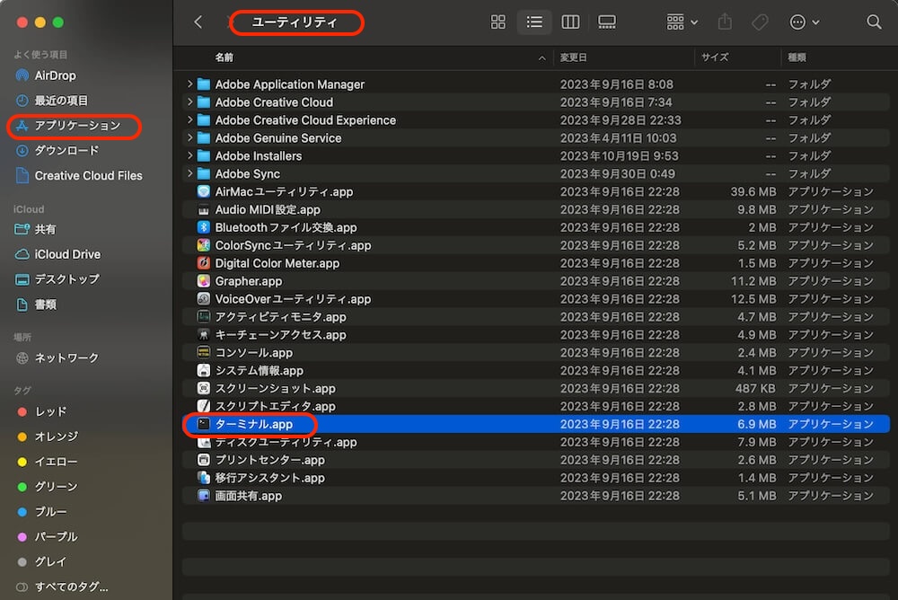 アプリケーション > ユーティリティ > ターミナルapp を開く